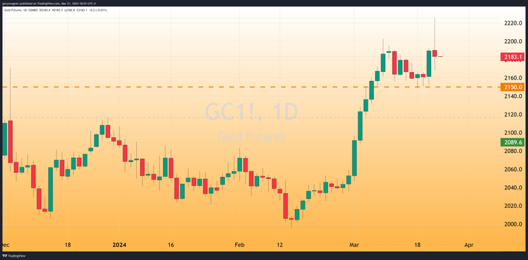 Right after this month’s FOMC meeting concluded and Chairman Powell held his regular press conference, gold began to move into uncharted territory. As of 5:40 PM EDT, gold futures basis most active April contract is currently fixed at $2183.80,which is a net loss of $6.30, or 0.29% today. However, the history that was made today was not in gold’s closing price but rather its intraday high. Gold traded to an intraday high over $20 above the former record high of $2203 when traders pushed gold to $2225.30 in today’s trading.