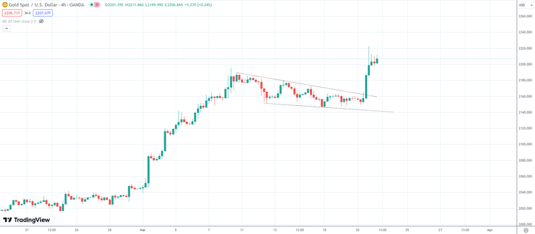 (Kitco Commentary) - Tuesday, I showed you an updated view of the flag formation in gold. As was expected, yesterday’s FOMC was the catalyst for the breakout, which came to the upside. The 4-hour chart below shows the dramatic follow-through higher once the topside of the flag was cleared.