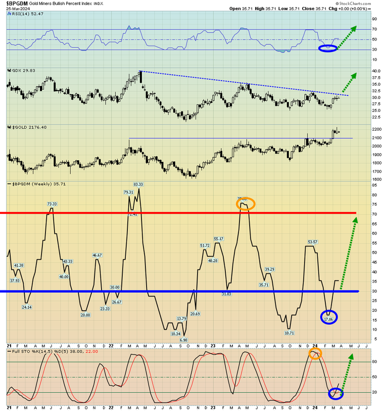 Double-click to enlarge this weekly BPGDM gold stock sentiment chart. Both the index and the key 14,5,5 series Stochastics oscillator suggest the miners are set for a spring and early summer surge.
