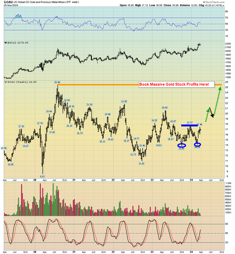 Double-click to enlarge. Basis the weekly GOAU chart, a Friday close over $18 is the catalyst for the launch of the next (and stronger) stage of this rally.