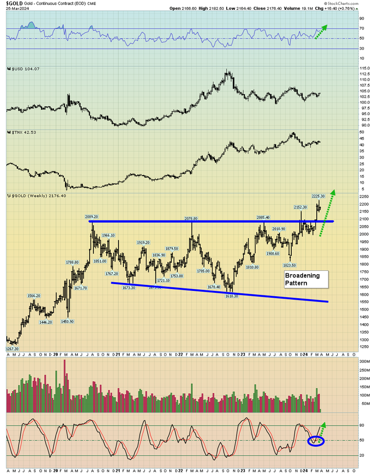 There’s a time to cheer and a time to buy. Now is a time to cheer, and to do that with gusto. Double-click to enlarge this spectacular weekly gold chart. A broadening formation breakout is clearly in play.