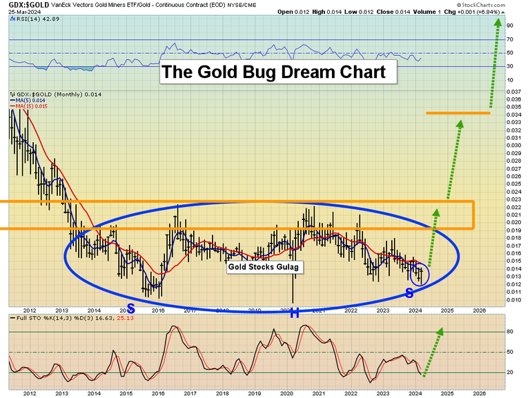 Double-click to enlarge this stunning GDX versus gold monthly chart. A massive ten-year inverse H&S pattern is in play.