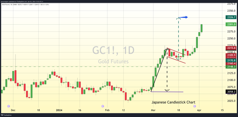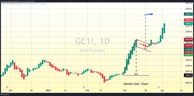 As of 4:55 PM EDT the most active June contract of gold futures is fixed at $2300.60, up $28.100. This marks the sixth consecutive day of gains for the precious yellow metal, with the last four trading sessions culminating in new record closes.