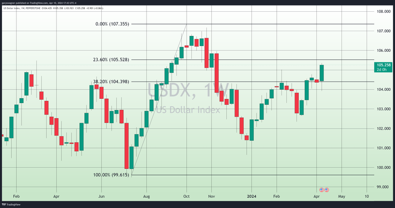 Collectively, this new information about inflation and the conversation held by Federal Reserve officials quickly led to significant volatility and price changes in multiple financial sectors and markets. Treasury yields moved higher as investors challenged the timing of the first rate cut and the number of cuts the Federal Reserve will implement this year. Higher treasury yields supported a strong upside move in the dollar index. As of 5 PM EDT, the dollar was up 1.04%, taking the dollar index to 105.258.