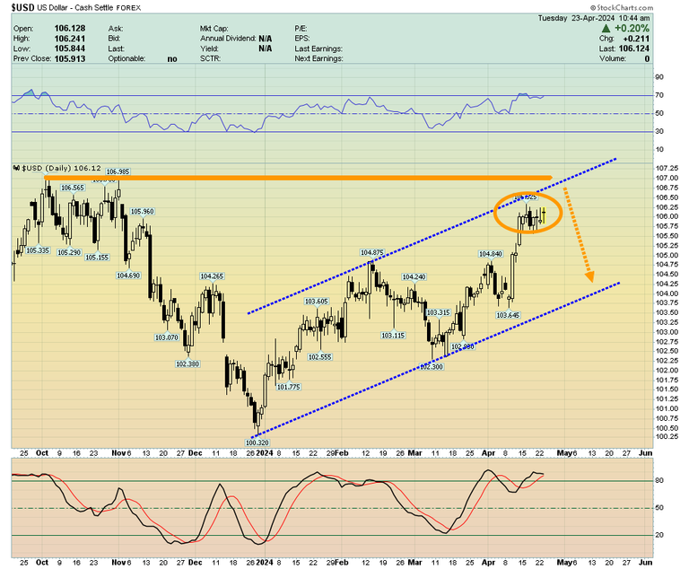 When investors try too hard to make gold into a fiat currency slave, they tend to end up in trouble, but for a look at the dollar against other finite fiats. Double-click to enlarge. The dollar is likely peaking about here. Resistance at 107 is just above the current price.