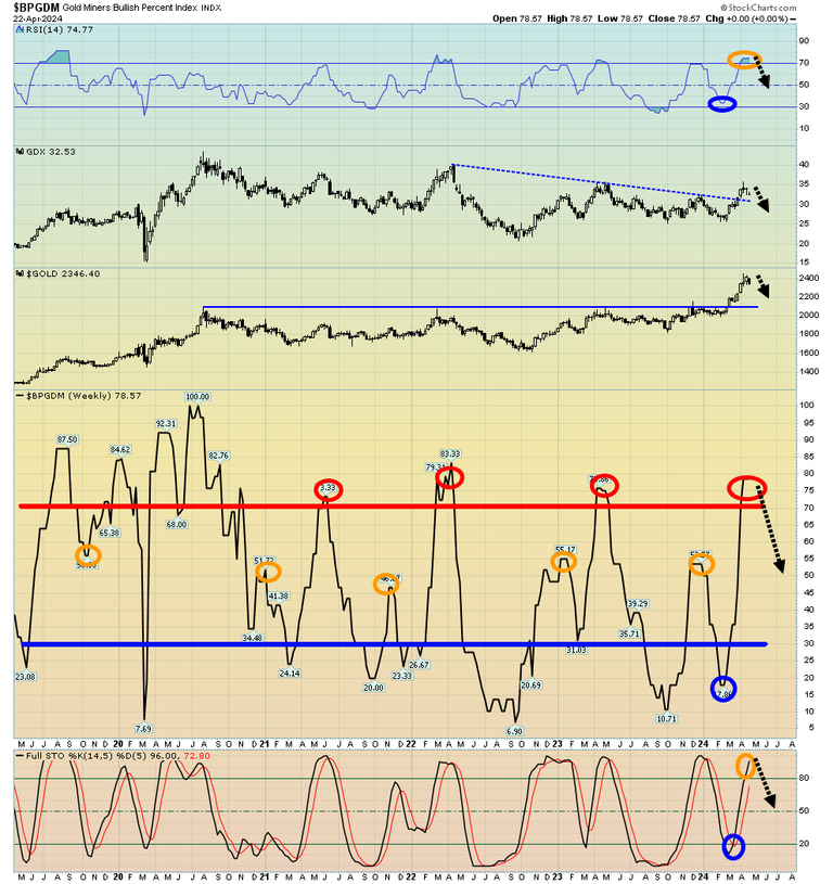 Double-click to enlarge this weekly sentiment index chart. It’s also overbought, and a gold market bull flag that takes a month or so to form would likely see the BPGDM pull back to its momentum zone of 50.