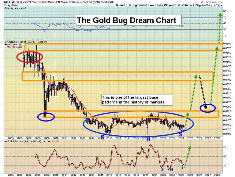 Double-click to enlarge. While gold stocks are incredibly overbought on medium-term charts, on the long-term charts versus gold, they are one of the most undervalued sectors of all time… and the huge base pattern in play suggests that a sea change lies dead ahead.