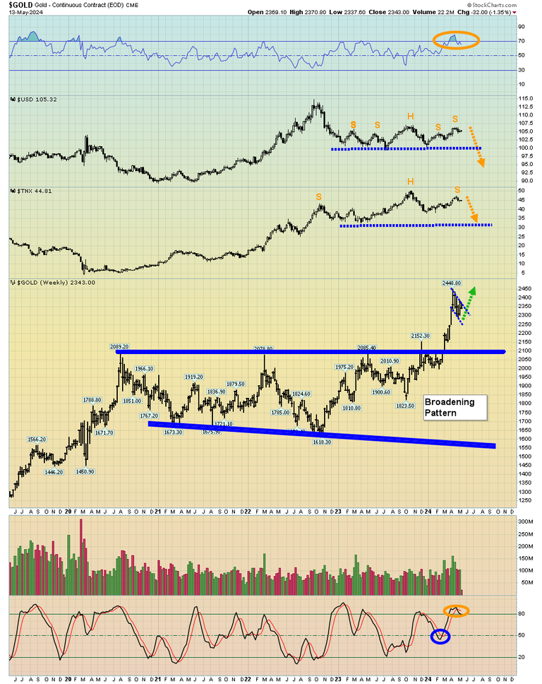 - Note the fiat dollar and US interest rates at the top of the chart. They have both formed very loose and rough top patterns. The sticky inflation reports (and huge Main Street inflation), overvalued stock market, and endlessly bungled wars keep the dollar in safe-haven mode versus other fiats…