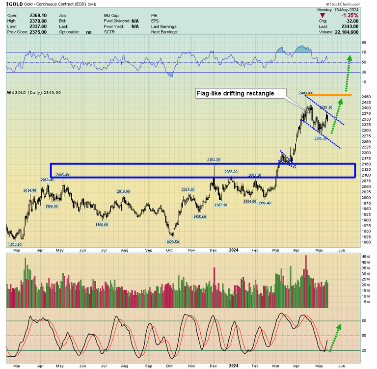 What about the technical picture? Double-click to enlarge this key weekly gold chart. Gold’s price action is quite boring even though a bull flag may be in play. It could play out as indicated or simply morph into a “consolidatory blob”.