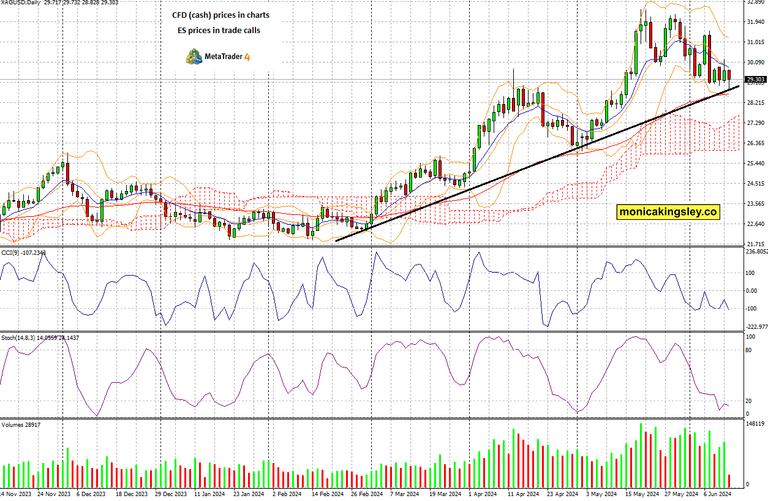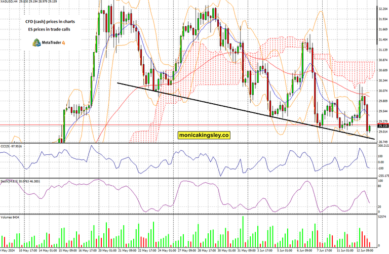 Instead of the usual precious metals chart, I'll feature two silver ones, and say that gold is displaying bullish divergence as it didn't fall below Friday's close, leaving the possibility of slamming below $2,270s in doubt, and keeping above $2300 as more probable. Given the gold silver ratio looking to go silver's way towards the end of the month, that would leave more appreciation potential with the white metal, as soon as these two support lines (on the 4hr and daily charts) are proven to have held (both posted earlier today in the premium Trading Signals channel).