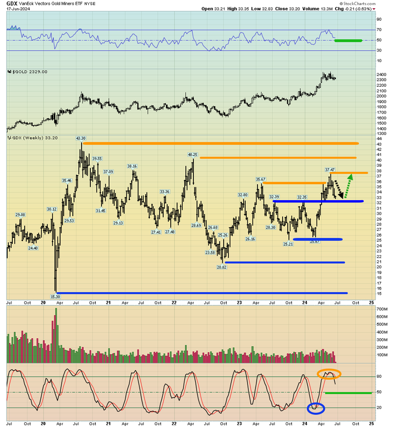 Double-click to enlarge. On the weekly GDX chart, the RSI and Stochastics oscillators are both moving down towards the 50 zone (a key zone for momentum buyers)… but they are not quite there.