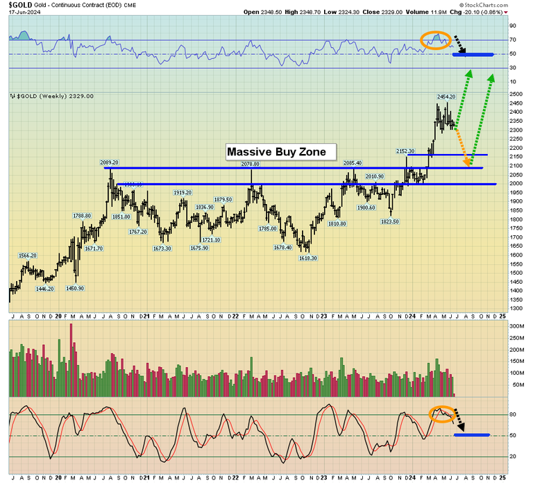 - If the current price congestion is resolved to the downside, the good news is that it would likely see gold trade at the massive $2150-$1985 buy zone for gold, silver, and the miners.