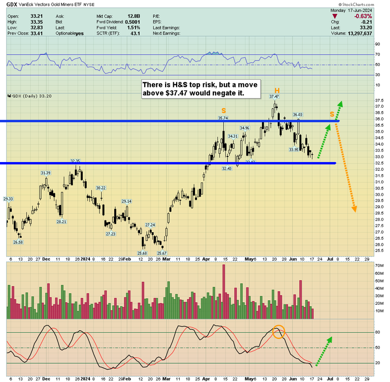 The miners? Double-click to enlarge. On this daily chart for GDX, the potential H&S top danger is clear. The good news is that the key 14,7,7 series Stochastics oscillator is now fully oversold. A move above 20 would be positive.