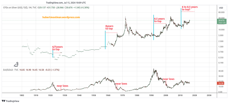 Once in the bull market, significant silver peaks occurred within 8.5 years, as measured from the Dow/gold ratio peak (marked in red), with the Great Depression silver peak occurring the soonest (6 to 7 years after).
