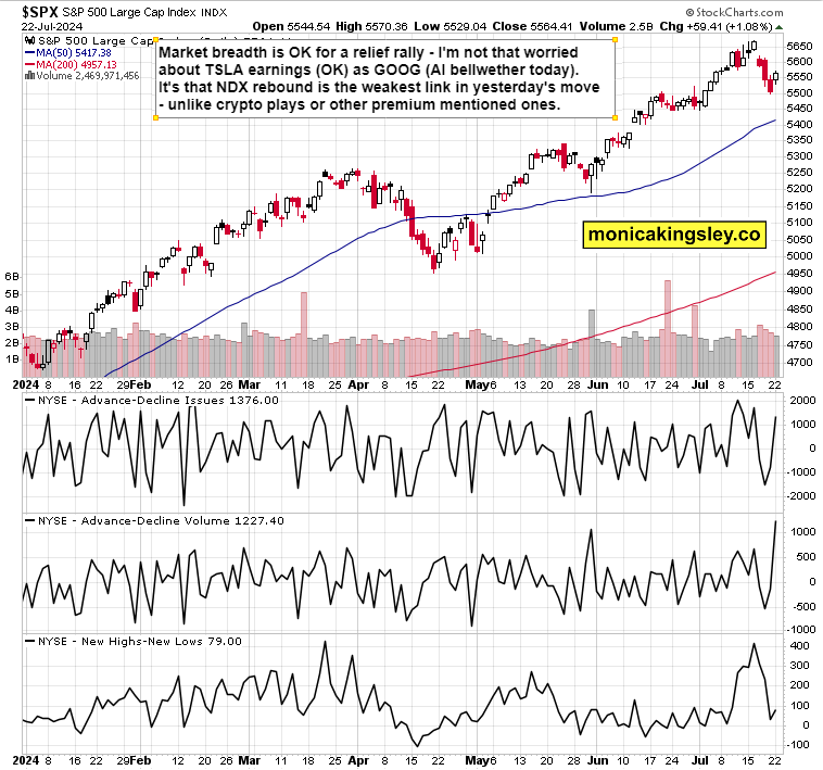 In a reversal of uncertainty, S&P 500 repelled one serious intraday downswing, and rose on solid volume and market breadth improvements. The about to get tired move can continue into today‘s earnings aftermarket – with GOOG being the key one, followed by TXN (the latter one I expect to do better). Housing data and Richmond manufacturing are unlikely to upset equities much, yet it must be noted that rate cutting odds slightly retreated yesterday (no cut Sep has 6% odds now).