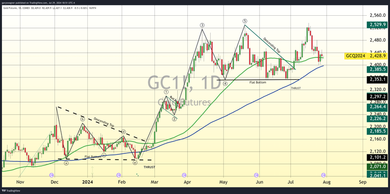 The December contract (GC Z24) has now become the most actively traded month for gold futures. Today December gold opened at $2,438.80, reached a peak of $2,450 before settling at $2,429.40. Currently gold futures have edged slightly lower, trading at $2,427.90.