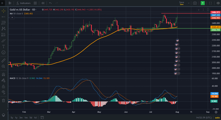 The daily time frame clearly shows that the gold price is once again in an uptrend, with the 50-day SMA, highlighted in orange in the chart below, providing significant support. The gold price is also trading above the 50-day SMA, which tells us that the bulls are very much in control of the price, and the MCAD indicator, which is widely considered a tool to measure the strength of the current trend, also indicates that it is bulls who are in control of the price. The red line indicates the next significant resistance, and if the current momentum persists, the US NFP data could propel us to that level tomorrow. However, if the data fails to impress, we could certainly see the price moving towards the 2354 price level mark, represented by the green horizontal support line.