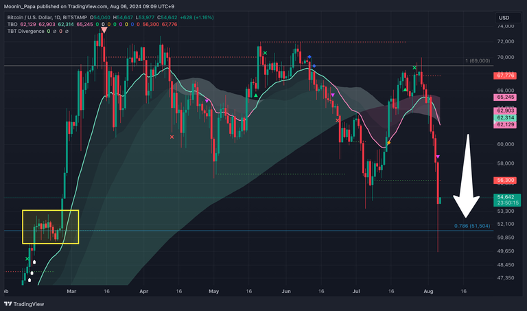 On Monday’s daily candle, Bitcoin fell to a low of $49,577 on Bitstamp’s BTC/USD chart, piercing the 0.786 Fibonacci level at $50,112. Despite the price of $BTC producing a lower wick that pierced this previously untested support level, the chart is clear that we saw an extreme price reaction due to the market-wide sell-off and mass liquidation event. It should be noted that Bitcoin respected historical price action just below the 0.786 Fibonacci level from February 2024, highlighted in the yellow box.