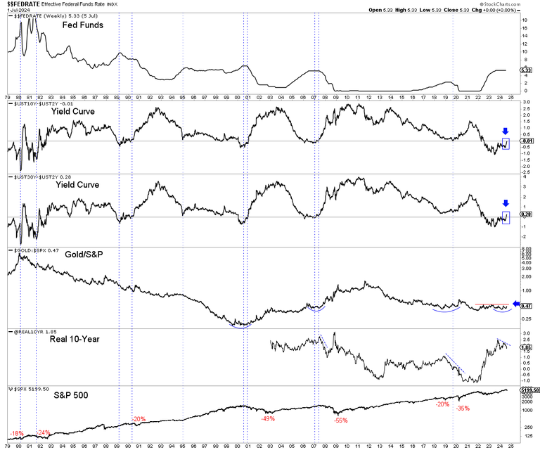 The last three times this occurred, it marked the start of Gold outperforming the stock market, Fed easing, and lower real interest rates.