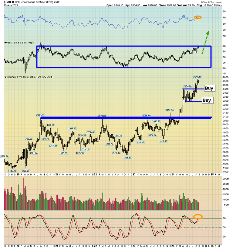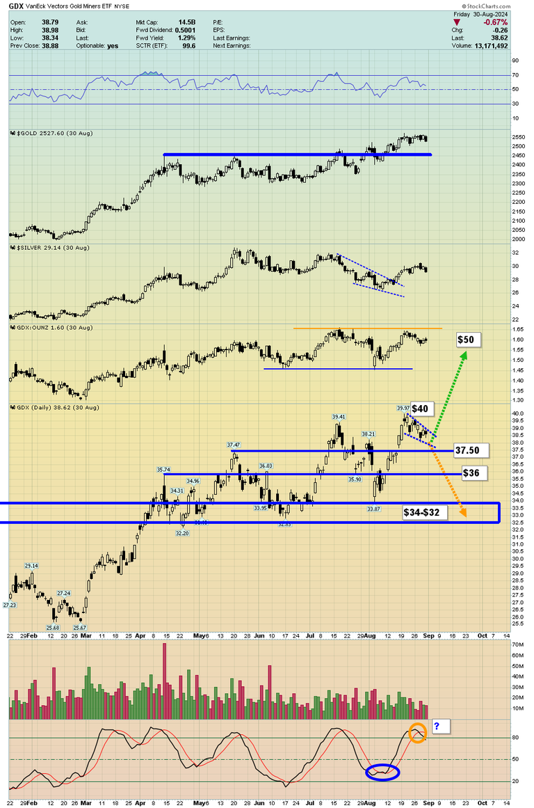 - GDX could make it to $43 or even $50 before the inevitable pullback begins, and gold could be at $2600+. Investors can focus on $36 and $34-$32 for GDX as support zones that may correlate with $2450 gold.