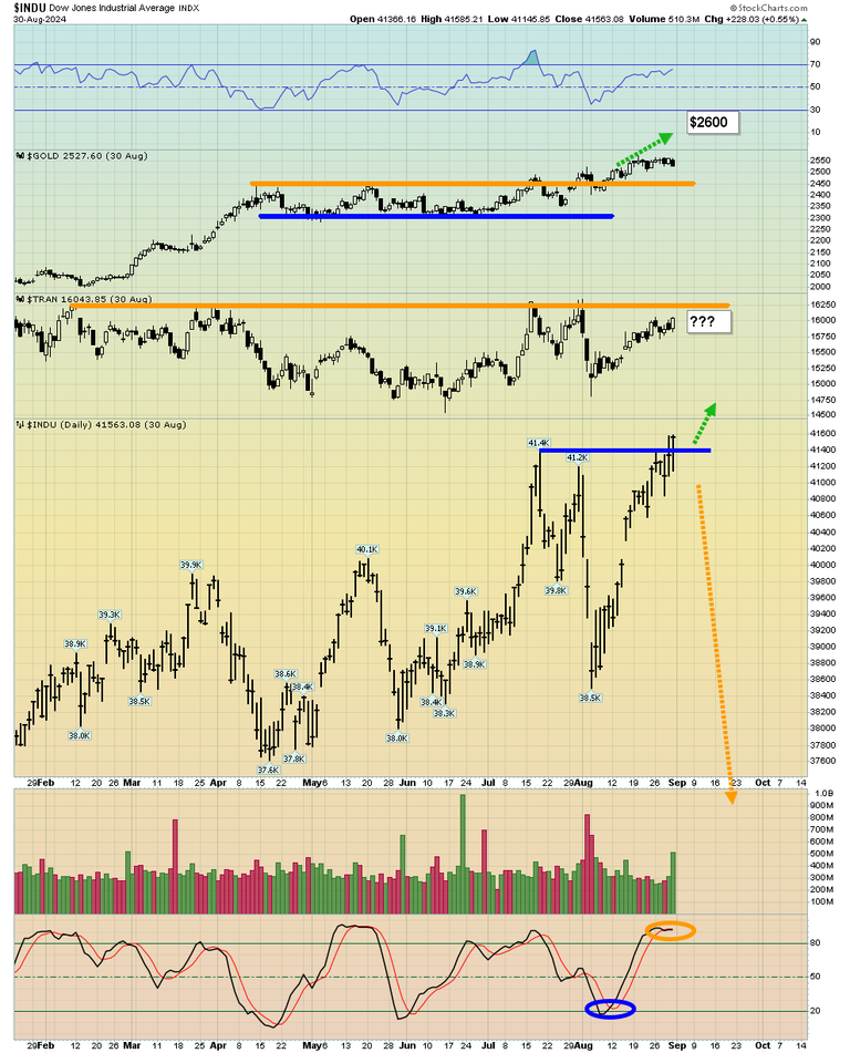 Double-click to enlarge this US stock market chart. The Dow Industrials have made a new intermediate trend high, but the Transports have not.