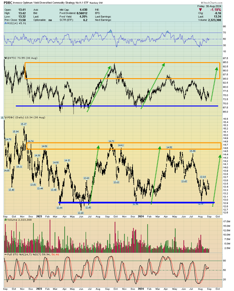 Double-click to enlarge. This PDBC commodities ETF appears to be basing. Note how similar the action is to oil, which is the largest component in most commodity indexes. A move above $15 for the PDBC would likely coincide with oil moving back above $100.