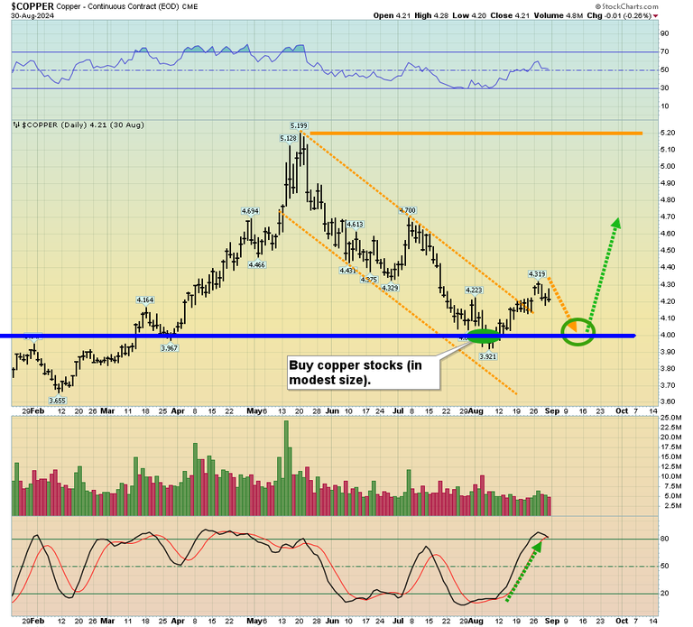 Double-click to enlarge. Here’s a look at key commodity copper. It may also be bottoming and doing it in my $4 buy zone.