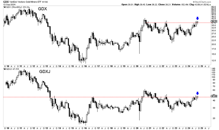 There are two weeks left in the month, but the monthly chart shows significant breakout potential if GDX and GDXJ maintain their current levels.