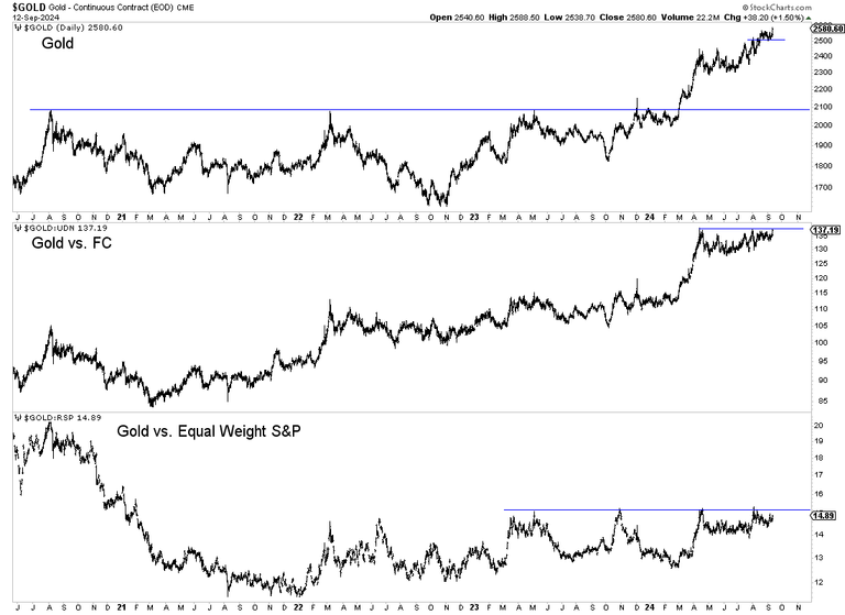 Gold against foreign currencies (Gold vs. FC) is breaking out from a five-month consolidation, and Gold against the equal-weighted S&P 500 is on the cusp of a new three-and-a-half-year high.