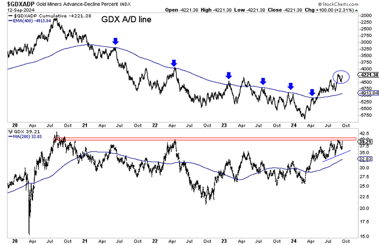 The GDX advance-decline line, an excellent leading indicator, is in a new primary uptrend and just a smidge from another high and two-year high.