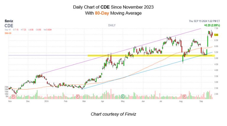 Coeur Mining shares managed to break above pressure at the overhead 80-day moving average on Thursday, Sept. 12, following news the company was able to expand output at its Rochester mine in Nevada. Previously, support stemmed from a floor near $5.20.