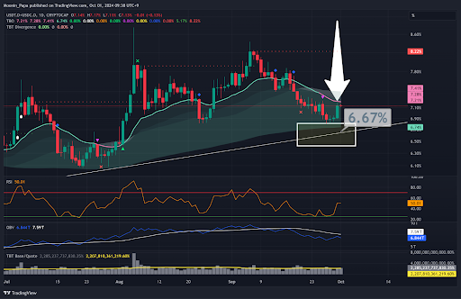 The key bullish signal for the market would be a break below the daily TBO Cloud for stablecoin dominance. This would indicate that market participants are using their stablecoins to buy Bitcoin and altcoins, fueling a bullish rally across the board.