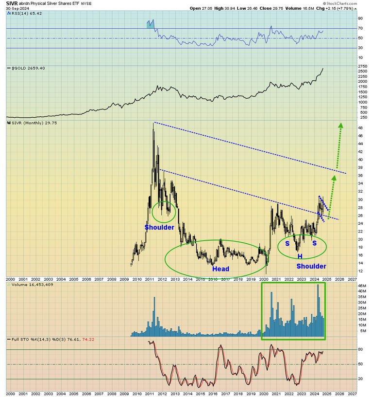 Double-click to enlarge this spectacular long-term silver chart. I’ve dubbed silver bullion as, “Prince Hi Ho”, and every technical item on this chart says… up we go! Silver sports the same massive inverse H&S pattern that gold has already broken out of, but it’s much looser for silver.
