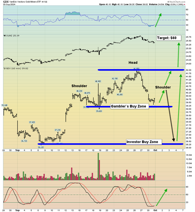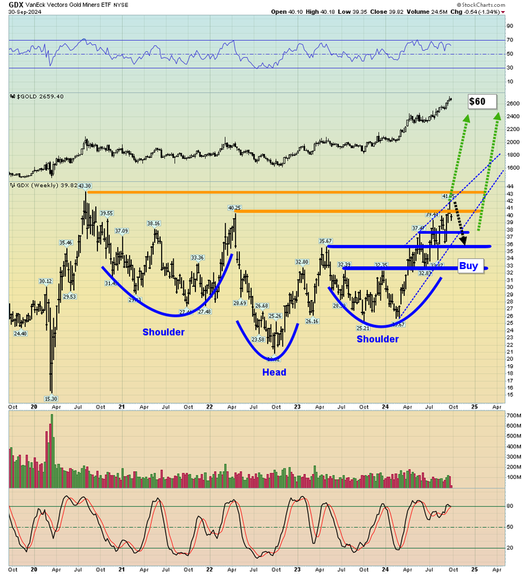 For a look at a key weekly chart for GDX. Double-click to enlarge. It seems almost surreal that GDX is still trading below its year 2020 high while gold bullion is about 30% higher, but this inverse H&S pattern suggests GDX is poised for its own rocket ride… to a target price of about $60!