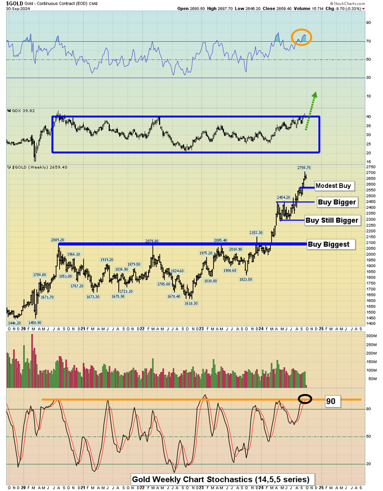 - Investors who have no gold should generally buy modest amounts on 5% sales that end with the price roughly at modest support zones on the chart. Silver bullion and mining stocks can be bought there too.