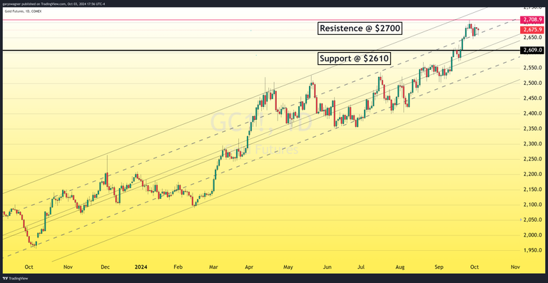 The gold market has entered a consolidation phase following recent record-breaking performances. After reaching an all-time high of $2,708.70 and a record closing price of $2,695.10 on Thursday, September 26, gold futures have shown a slight downward bias. As of 5:00 PM EDT, the most active December contract settled at $2,676, representing a modest decline of $4.20. Since last Thursday's peak, gold prices have experienced a 0.68% decrease, reflecting the market's current state of equilibrium.