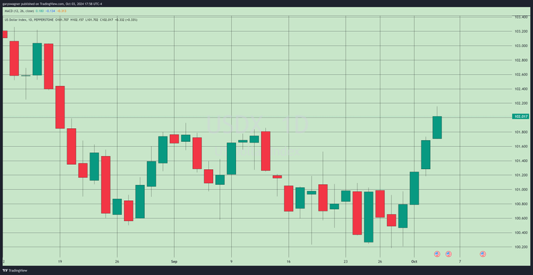 The recent fluctuations in gold prices can be attributed to several key factors, with dollar strength as a primary influence. The U.S. dollar has been asserting its safe-haven status, demonstrating remarkable strength throughout the week. The dollar index opened at 100.468 on Monday and consistently gained ground, rising by 0.30%, 0.45%, 0.44%, and 0.34% over four consecutive days. This surge has propelled the index to 102.027, marking a substantial 1.559% increase against a basket of six major currencies.