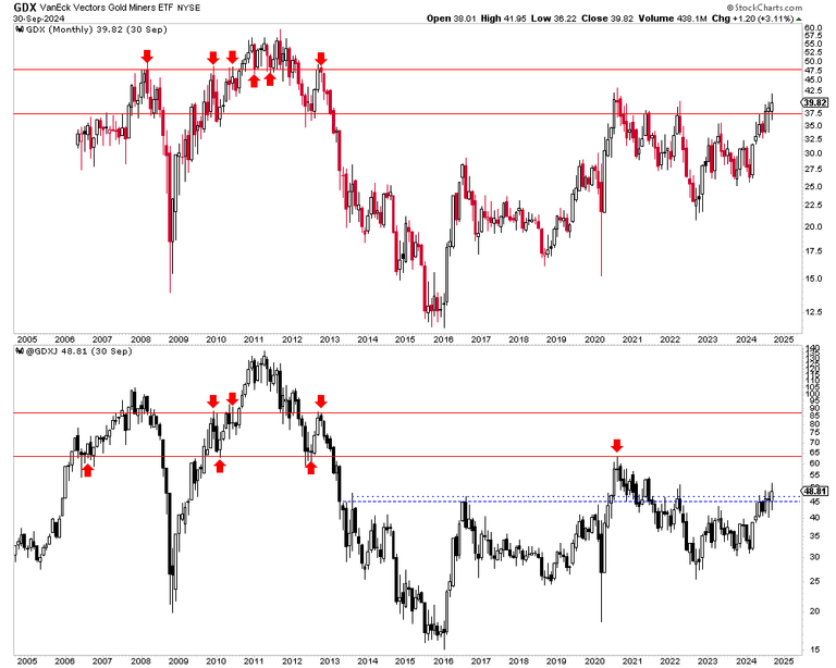 Finally, we show the monthly charts of GDX and GDXJ in the image below.