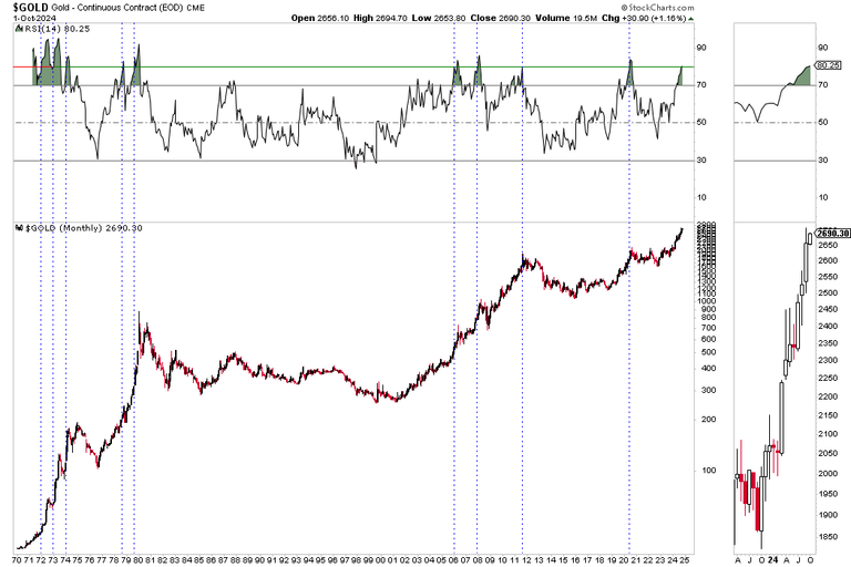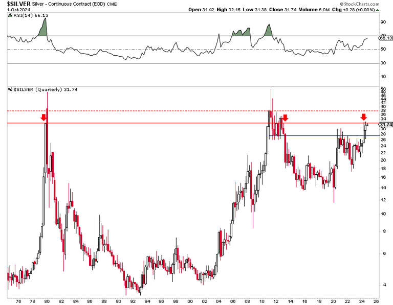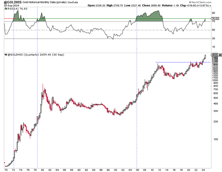 The quarterly chart for Gold shows similar quarterly momentum in early 1972, mid-1978, and late 2005.