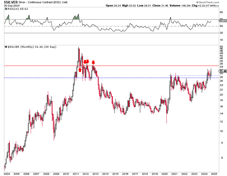 Silver is more interesting as, unlike Gold, it is not close to its all-time highs.