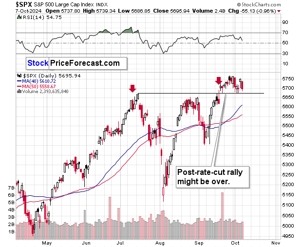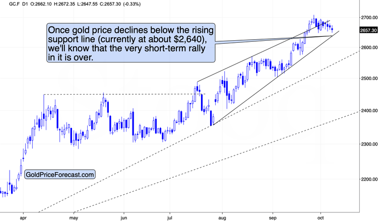 The rising short-term support line is less than $20 away – at about $2,640. A breakdown below this line would clearly confirm that the top in gold is in, and that lower – probably much lower – gold prices would be likely.