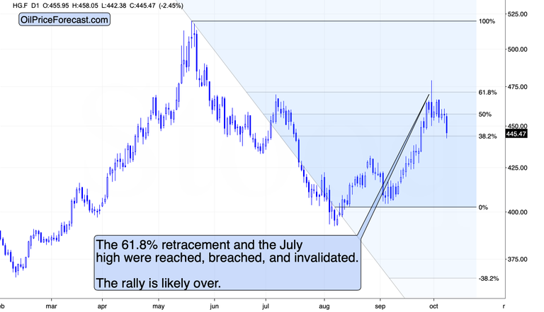 I previously wrote that copper’s invalidation of the move above its July high and the 61.8% Fibonacci retracement was a bearish event and that it likely marked the end of the rally. Given today’s decline in copper prices – that appears to have been the case.