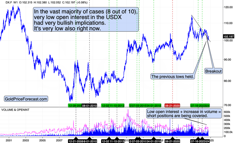 How do I know? Because we see that open interest for the USD Index futures dropped and it remains at very low levels, while the volume moved higher.