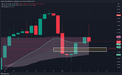 Bitcoin’s upward momentum has hit a significant barrier at $64,400, a level that has been difficult to overcome. While the 1.618 Fibonacci support level has been pierced and closed below several times, it remains a logical next step for support in the near term. However, it’s important to watch how price action develops around this area to determine if it will hold or if further downside is ahead.