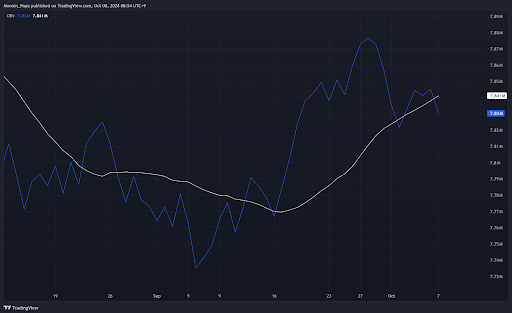 A concerning development is the behavior of On-Balance Volume (OBV). OBV recently crossed below its white moving average, indicating that cumulative volume—and by extension, market interest and confidence—are on the decline. While the moving average is still trending upwards, the question remains whether this upward movement will be strong enough to pull Bitcoin’s price back up. Right now, it seems unlikely that this will be enough on its own to sustain a recovery.