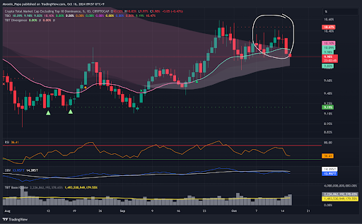 Altcoins are now facing their own challenges, as evidenced by OTHERS.D (a chart tracking altcoin dominance excluding Bitcoin and Ethereum). OTHERS.D retreated back into the daily TBO Cloud as Bitcoin pumped, indicating that altcoins are struggling to keep pace with Bitcoin’s rally.