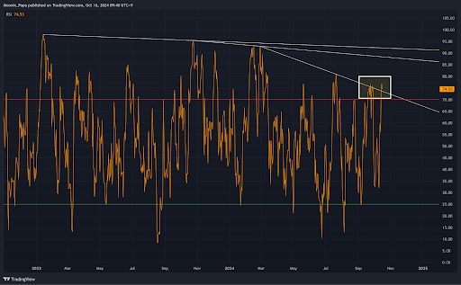 Zooming out on the daily timeframe reveals another bullish signal: the RSI has pierced through a long-standing resistance fan that dates back to January 2023. This RSI breakthrough suggests that Bitcoin’s upward momentum is gaining strength and could continue in the near term.