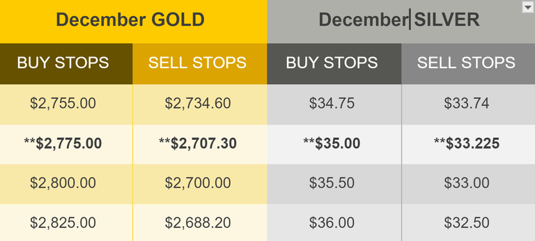 Below are today’s likely price locations of buy and sell stop orders for the active Comex gold and silver futures markets. The asterisks (**) denote the most critical stop order placement level of the day (or likely where the heaviest concentration of stop orders is placed on this day).