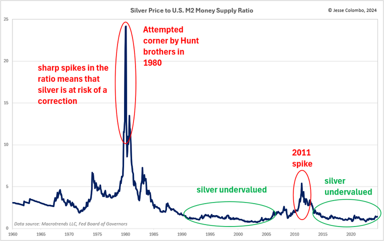 Another way to assess whether silver is undervalued or overvalued is by comparing it to various money supply measures. The chart below shows the ratio of silver’s price to the U.S. M2 money supply, providing insight into whether silver is keeping pace with, outpacing, or lagging behind money supply growth. If silver’s price significantly outpaces money supply growth, the likelihood of a strong correction increases. Conversely, if silver lags behind money supply growth, it suggests a potential period of strength ahead. Since the mid-2010s, silver has slightly lagged behind M2 growth, which, combined with other factors discussed in this piece, position it for a strong rally.