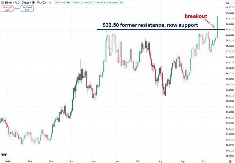 The key criterion I outlined to confirm the next leg of the silver rally was simple yet widely overlooked by investors and surprisingly difficult to achieve: the spot price of silver must decisively close above the $32.50 resistance level, supported by strong trading volume. The $32.50 resistance level was set at the May high, after which silver retreated and stagnated over the summer. Silver made attempts to break through this level on September 26th and October 4th, but both attempts failed, resulting in further pullbacks. Silver's impressive $2.02 (6.38%) surge on Friday, accompanied by trading volume more than double the prior week’s average, definitively fulfills that criterion. (A caveat to consider is that if silver closes back below the $32.50 resistance level, it would invalidate Friday’s bullish signal. However, I find that scenario unlikely.)